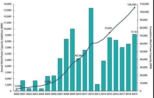 圖1:2000-2019年美國風(fēng)電新增/累計風(fēng)電裝機容量