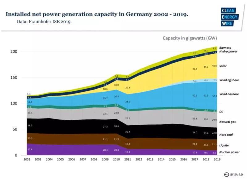 根據(jù)德國根據(jù)能源市場研究組織AG Energiebilanzen初步數(shù)據(jù),2019年底德國發(fā)電裝機容量為: