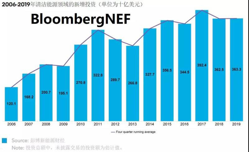 2019年,廣泛的清潔能源投資總額達(dá)3,633億美元,其中包括研發(fā)資金以及從公開市場、風(fēng)險(xiǎn)投資和私募股權(quán)交易進(jìn)入專業(yè)企業(yè)的資金,略高于上年更新后的投資總額3,625億。
