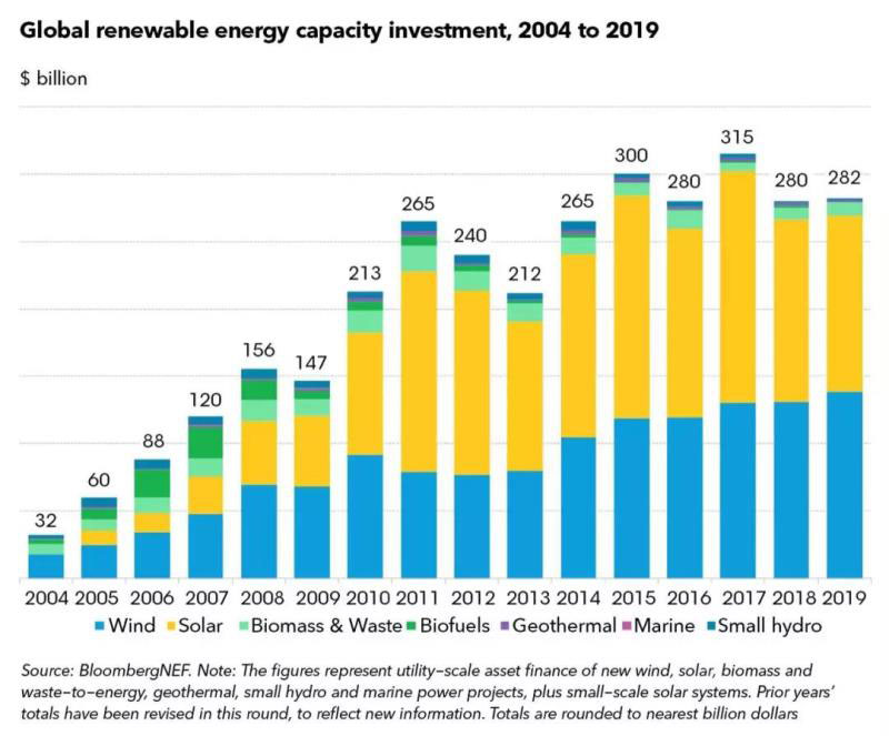 從2019年的整體可再生能源產(chǎn)能投資數(shù)據(jù)來看,陸上和海上風(fēng)電以1382億美元領(lǐng)先,增長了6%;太陽能為1311億美元,下降了3%。兩者合計(jì)2018年增加約180吉瓦,比2018年增加20GW。生物質(zhì)能(包括廢物轉(zhuǎn)化為能源)的投資在2019年達(dá)到97億美元,增長9%;地?zé)犴?xiàng)目10億美元,下降了56%;生物燃料為5億美元,下降了43%;小水電為17億美元,下降了3%。