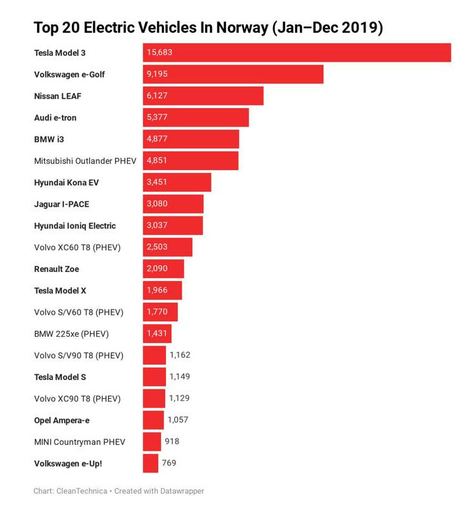 對于挪威以外的人來說,令人驚訝的結(jié)果可能是排名第二的大眾電子高爾夫,它在大多數(shù)市場中并不是特別“熱門”。但在插電式電動汽車市場,這款車型占有顯著的11%,在挪威總體上排名第二。