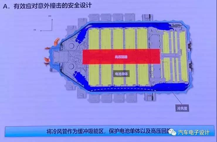 在下圖中,我們可看到如此大的這個電池外部圍了一圈冷風管,可能是作為緩沖吸能區(qū)來保護電池和高壓回路,前面一部分則是風機。