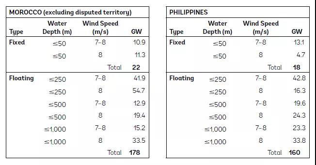 本報告介紹了關(guān)于巴西、印度、摩洛哥、菲律賓、南非、斯里蘭卡、土耳其和越南,八個海上風電技術(shù)潛力的案例研究(這里,技術(shù)潛力是根據(jù)風速和水深計算的)??紤]到200公里以內(nèi)的沿海海域,這8個國家共有約3.1太瓦的總技術(shù)潛力,包括10.16億千瓦的固定式裝機容量和20.66億千瓦的浮式裝機容量(見表1)。