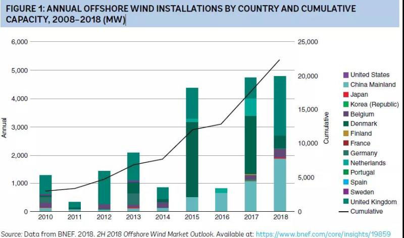 圖1 2008-2018年按國家和累計總量劃分的年度海上風電裝機容量(兆瓦)