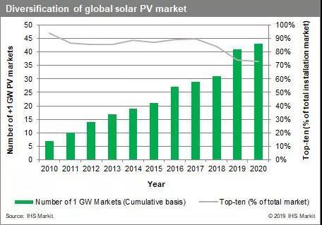 在可預(yù)見的將來(lái),像中國(guó)這樣的大型市場(chǎng)仍將繼續(xù)占領(lǐng)全球裝機(jī)的很大份額。但隨著其他地方產(chǎn)能增加,未來(lái)幾年全球太陽(yáng)能裝機(jī)增長(zhǎng)對(duì)中國(guó)市場(chǎng)的依賴將持續(xù)減少除中國(guó)以外的全球領(lǐng)先市場(chǎng)的安裝量在2019年增長(zhǎng)了53%,預(yù)計(jì)到2020年將繼續(xù)保持兩位數(shù)的增長(zhǎng)。總體而言,前十大太陽(yáng)能市場(chǎng)的總體市場(chǎng)份額預(yù)計(jì)將下降至從2010年的94%降至73%。