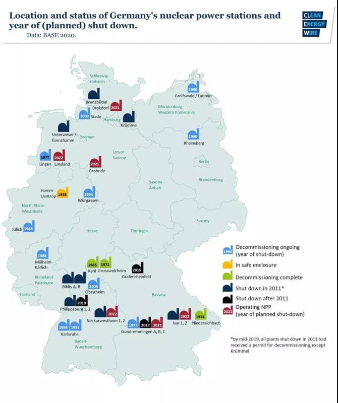 目前,德國(guó)尚有6座核電站將于2021/2022年期間全部停運(yùn),2019年德國(guó)核電發(fā)電量75.2TWh,占總發(fā)電量比例為12.5%。