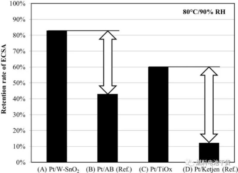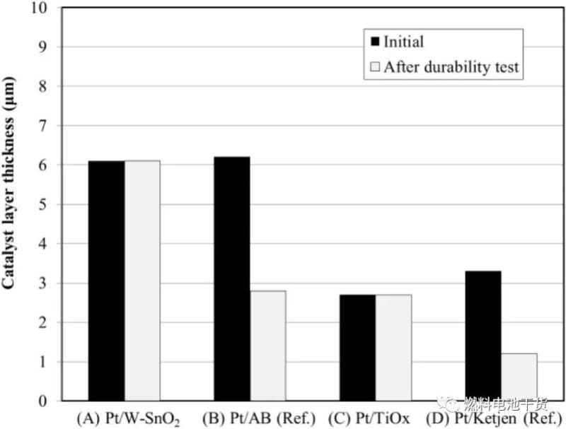 如下圖所示,由于氧化物載體在高電位下不發(fā)生腐蝕,催化層厚度也不會降低。因此,氧化物載體Pt催化劑顆粒的團聚生長被限制,電化學(xué)活性面積留存率提高。換言之,如果金屬氧化物載體MEA性能下降,很可能是因為Pt催化劑衰減導(dǎo)致,并非金屬氧化物載體衰減引起。上述現(xiàn)象表明,氧化錫或氧化鈦載體可以被用在一個追求優(yōu)異的高電位耐久性燃料電池系統(tǒng)。