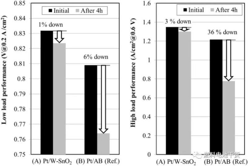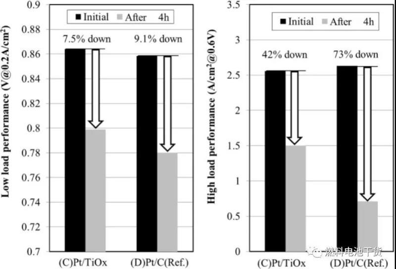 下圖表明在高電位耐久性測試中(1.3V/80℃/90%RH./4 hours),氧化錫載體的MEA性能下降比傳統(tǒng)碳載體MEA小。此外,在30℃/100%RH條件下經(jīng)過1200次高電位循環(huán)(1 cycle:1.3 V/s, 0 V/s)后,氧化鈦載體的MEA性能下降也比傳統(tǒng)碳載體的MEA小。上述結(jié)果表明氧化錫和氧化鈦載體比傳統(tǒng)碳載體在高電位耐久性方面表現(xiàn)更佳。