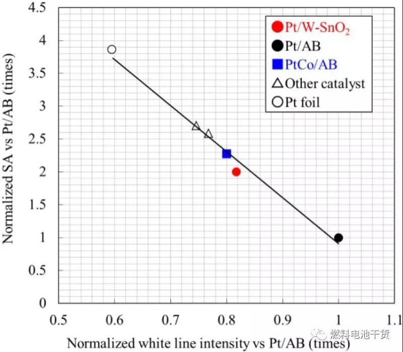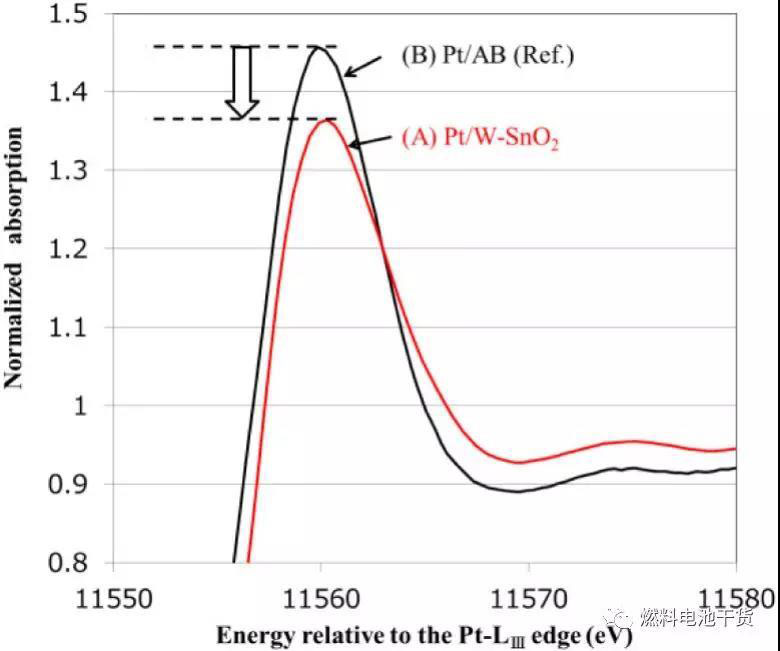 從下面兩張圖可以看到,Pt白線強度和X射線近邊吸收譜(XANE)測得的催化活性之間關(guān)系表面氧化錫載體Pt催化劑的電子狀態(tài)轉(zhuǎn)向更高的比活性。Pt/Sn合金的合成被認(rèn)為可以提高催化能,因此在Pt和氧化錫表面存在Pt-Sn鍵導(dǎo)致Pt/Sn合金形成。
