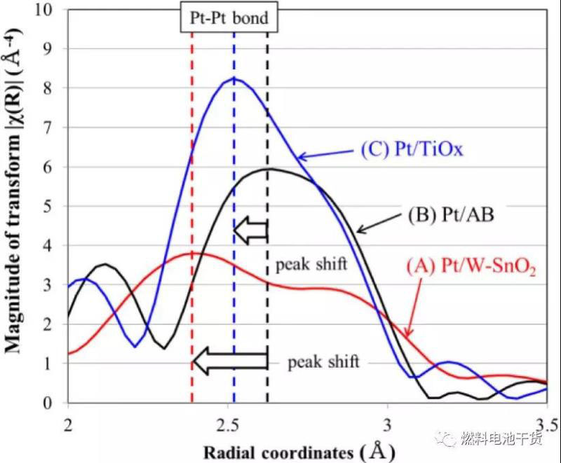 下圖為在Spring-8光源采用同步輻射進(jìn)行擴展S射線吸收精細(xì)結(jié)構(gòu)光譜測試獲得的動態(tài)分布函數(shù)。可以看到,氧化錫載體Pt催化劑中Pt-Pt鍵的峰值發(fā)生了變化,峰值移位表明Pt-Sn鍵和更小Pt-Pt原子間距的形成。