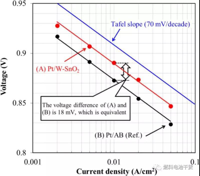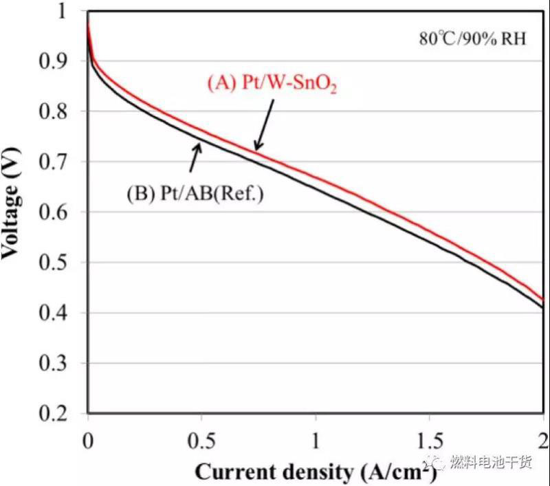 如下圖所示,氧化錫載體催化劑MEA性能在反應(yīng)催化活性的極低電密區(qū)間高于傳統(tǒng)的碳載體催化劑MEA。原因是氧化錫載體Pt催化劑的催化活性是碳載體Pt催化劑的1.9倍。氧化錫載體Pt催化劑的高催化活性由Pt-Sn鍵引起,Pt-Sn鍵使Pt-Pt原子間距變短。