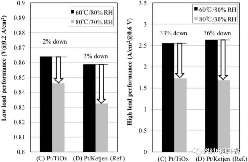 從下圖可以看出,陽極使用氧化鈦載體Pt催化劑的MEA性能在低電密至高電密區(qū)間也都高于傳統(tǒng)的碳載體催化劑。上述現(xiàn)象即使在低濕情況下同樣不會改變。MEA評估結(jié)果表明,可分別在陰極和陽極催化劑上采用氧化錫和氧化鈦載體材料。