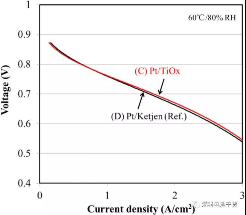 (C)Pt/TiOx和(D)Pt/Ketjen的MEA性能比較