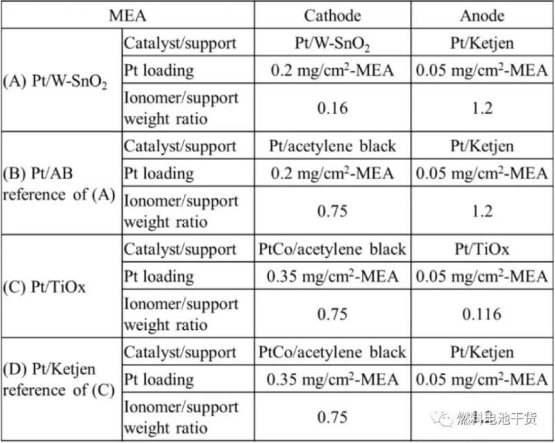 實驗研究中,陽極催化劑采用日本Sakai化學(xué)工業(yè)公司氧化鈦載體Pt催化劑(Pt顆粒直徑2.5 nm);作為參考對標(biāo),選取了豐田第一代Mirai燃料電池催化劑指定供應(yīng)商日本科特勒公司Ketjen碳載體Pt催化劑作為陽極催化劑(Pt顆粒直徑2.5 nm)。為確定氧化鈦載體Pt催化劑的陽極適用性,膜電極性能表征環(huán)節(jié)里采用了科特勒公司Pt/Co合金催化劑作為陰極催化劑。陰極催化劑采用日本Mitsui Mining&Smelting公司摻雜鎢的氧化銻載體Pt催化劑(Pt顆粒直徑2.5 nm);作為參考對標(biāo),科特勒公司乙炔碳黑載體Pt催化劑作為陰極催化劑(Pt顆粒直徑2.5 nm)。為確定氧化銻載體Pt催化劑的陰極適用性,膜電極性能表征環(huán)節(jié)里采用科特勒公司Ketjen碳載體Pt催化劑作為陽極催化劑。