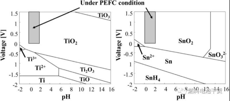下圖為pH值和電位關(guān)系的Pourbaix圖。圖中可以看出,相比碳,氧化鈦和氧化錫在高電位環(huán)境下更穩(wěn)定,是有前途的長壽命載體材料。已知,摻雜鎢或銻金屬的氧化錫和缺氧氧化鈦(如氧化鈦中具有最高電導(dǎo)率的Ti407)具有高電導(dǎo)率。因此,大量研究和報道測試了上述化合物替代碳用作燃料電池催化劑載體的適用性。即使在高溫下,氧化錫產(chǎn)生較高電導(dǎo)率的機理在氧化環(huán)境中也較為穩(wěn)定,但在超過80℃的還原條件下并不穩(wěn)定。相反,即使在高溫下,氧化鈦產(chǎn)生較高電導(dǎo)率的機理在還原環(huán)境中較為穩(wěn)定,但在超過80℃的氧化環(huán)境中并不穩(wěn)定。綜上所述,豐田汽車公司實驗室認(rèn)為陰極和陽極的載體材料應(yīng)分別采用氧化鈦和氧化錫。