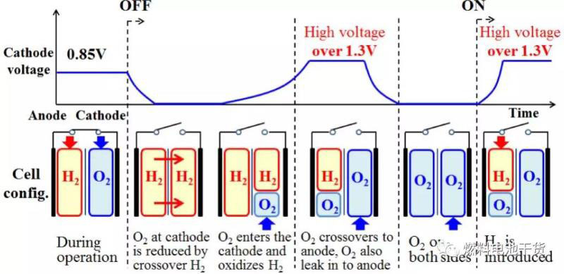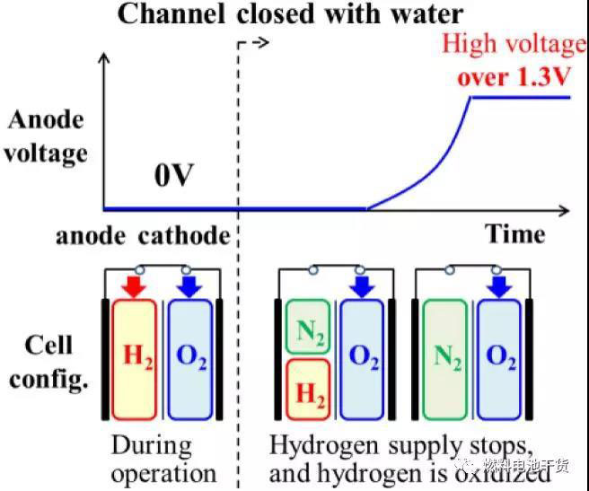 陽極欠氣(氫氣饑餓)會引起高電位,加速碳載體腐蝕。碳載體的腐蝕引起貴金屬催化劑顆粒團聚長大,減少電化學(xué)反應(yīng)的活性位點。此外,碳載體腐蝕還對質(zhì)子、電子和氣體的傳輸產(chǎn)生不利影響,引起不可逆的性能損失。