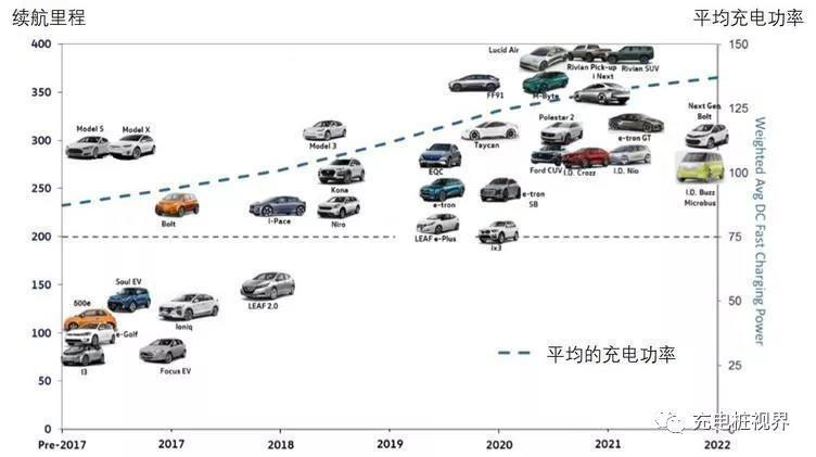 如下圖所示,目前面向2020年以后的美國市場純電動汽車的里程,標(biāo)配就是200英里+,充電功率在穩(wěn)步提升,目前大部分折合出來的平均充電功率在100kW左右。隨著后續(xù)純電動新車面市,主力都是設(shè)計在120-150kW,按照400V來看的話是300-350A。