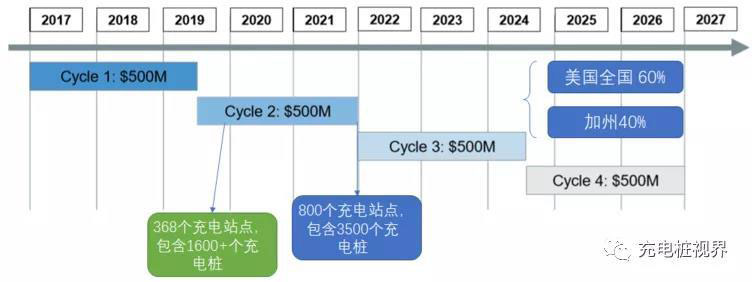 EA是在大眾汽車柴油門事件以后,大眾和EPA達(dá)成和解協(xié)議的一部分——必須在10年內(nèi)通過Electrify America在電動汽車基礎(chǔ)設(shè)施和意識教育方面花費(fèi)20億美元(40%用于加州,其他60%用于美國其他各地)。項目始于2017年,到2027年將包括四個周期,并且EA的網(wǎng)絡(luò)必須向其他車企保持中立,這些站點都提供CCS(150kW和350kW)和CHAdeMO(50kW)兩種充電接口。