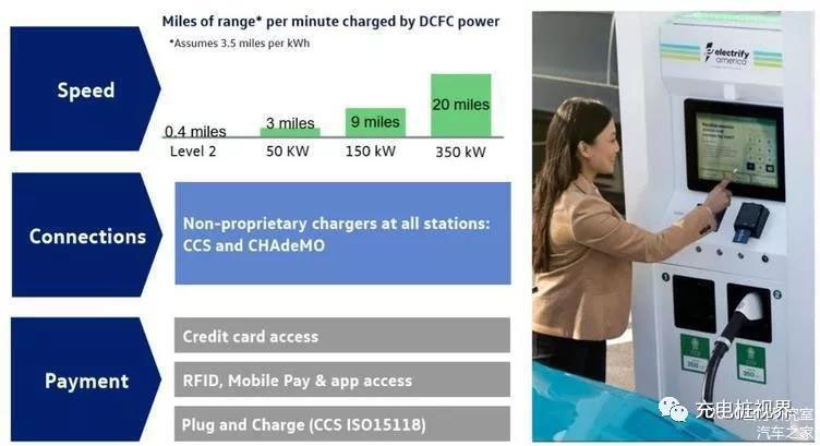 “Electrify America”其實是一個政府合作項目,其“由車企主導(dǎo)并且有特定資金投入”的特性,使得它的屬性有點像是Tesla的超充網(wǎng)絡(luò),這個項目的發(fā)展,特別是其面向高功率充電的發(fā)展尤其值得我們參考,因為在這個項目里面我們看到了超前設(shè)施對于電動汽車快充功率的設(shè)計引導(dǎo)性。