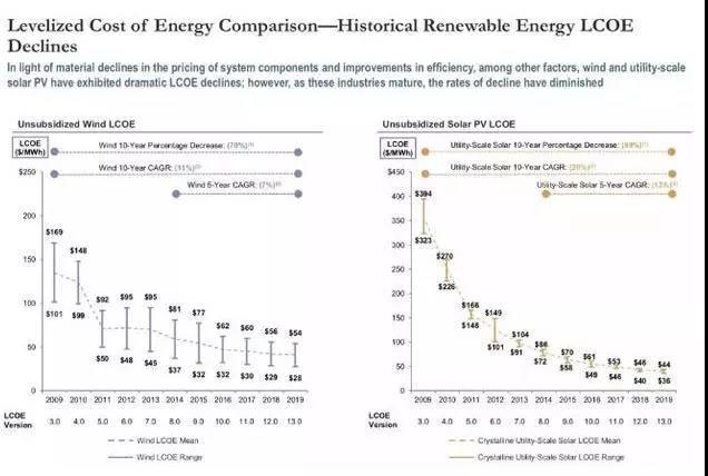 美國咨詢公司Lazard每年評估美國各類能源發(fā)電的全生命周期平準化成本(LCOE),2019年11月公布了第13個LCOE版本。