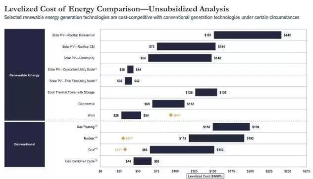 在不考慮聯(lián)邦政府稅收優(yōu)惠的情況下,美國各類能源發(fā)電平準化成本的區(qū)間如下:
