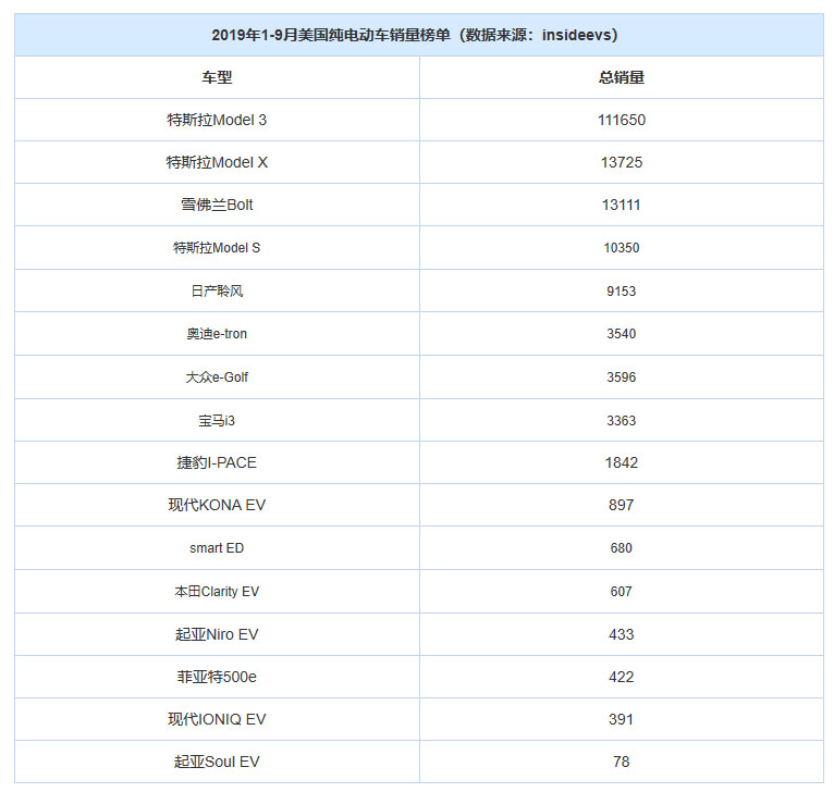 根據(jù)insideevs統(tǒng)計的數(shù)據(jù),美國在今年1月-9月的純電動車銷量總和為17.38萬輛,其中特斯拉車型的總銷量13.57萬輛,占比達到驚人的78%。而反觀剩下的22%那部分銷量,共涵蓋了16款車型,其中僅有一款車型由美國車企生產(chǎn),那就是來自通用的雪佛蘭Bolt。