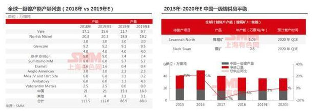2019年國內(nèi)部分硫酸鎳企業(yè)轉(zhuǎn)產(chǎn)一級(jí)鎳,國內(nèi)產(chǎn)量同比去年增加。但因硫化礦資源稀缺,一級(jí)鎳產(chǎn)量增幅有限,預(yù)計(jì)2020年產(chǎn)量平穩(wěn)。全球來看,高鎳價(jià)刺激停產(chǎn)產(chǎn)能復(fù)產(chǎn),SavannahNorth項(xiàng)目和BlackSwan項(xiàng)目已計(jì)劃于2020年復(fù)產(chǎn),或帶來一級(jí)鎳產(chǎn)量的增加,但同時(shí)BHP計(jì)劃于2020年二季度投產(chǎn)硫酸鎳并減少一級(jí)鎳的產(chǎn)量。SMM預(yù)計(jì)2020年全球一級(jí)鎳產(chǎn)量同樣平穩(wěn)。硫化礦重啟成本高且時(shí)間周期長,未來2年內(nèi)一級(jí)鎳產(chǎn)量平穩(wěn)。
