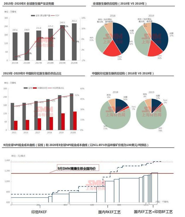 從全球原生鎳的供應(yīng)格局來看,2019年全球原生鎳產(chǎn)量為249萬鎳噸,同比增11%,增量來自中國和印尼的NPI。預(yù)計(jì)2020年全球原生鎳產(chǎn)量增長至262萬鎳噸,受中國NPI大幅減產(chǎn)影響,產(chǎn)量增速下滑。全球原生鎳供應(yīng)結(jié)構(gòu)中,二級(jí)鎳在NPI的帶動(dòng)下占比繼續(xù)上升,一級(jí)鎳占比下降。中國和印尼兩國原生鎳供應(yīng)將占全球供應(yīng)的50%,主要為NPI。預(yù)計(jì)2020年鎳礦漲價(jià)將導(dǎo)致國內(nèi)NPI生產(chǎn)成本超過1300元/鎳點(diǎn)。