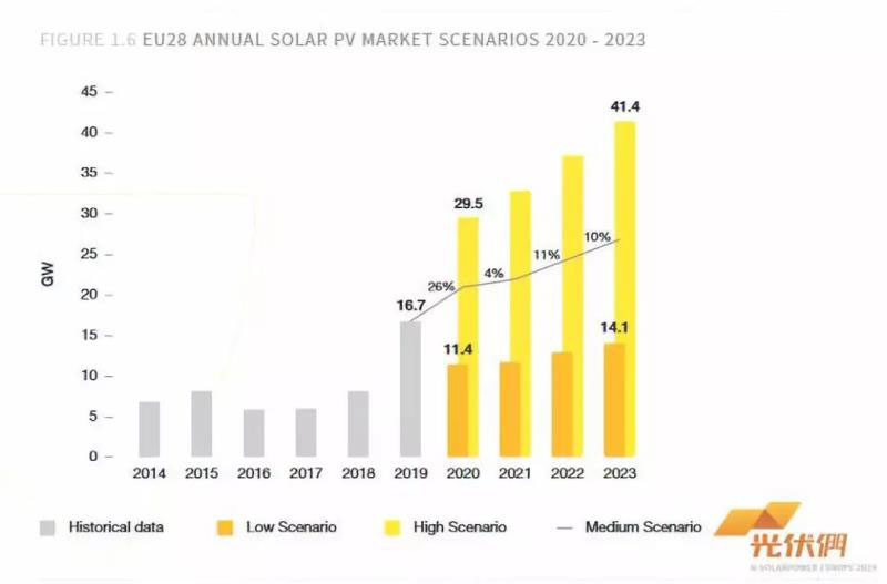 圖表:歐盟28成員國2020-2023年光伏市場預(yù)測(灰色為歷史數(shù)據(jù),橙色為較低預(yù)期,黃色為較高預(yù)期,灰色曲線為中等預(yù)期)