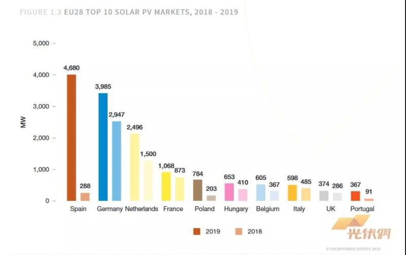 圖表:歐洲市場安裝量前十名(2018-2019)對比圖,來源:Solar Power Europe