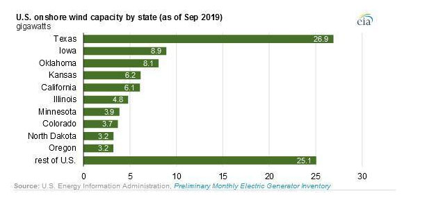 截至2019年第三季度,美國有41個州安裝了風力渦輪機。德克薩斯州的裝機容量最大,為26.9吉瓦,其次是愛荷華州,俄克拉荷馬州和堪薩斯州。這四個州占美國總裝機容量的一半。