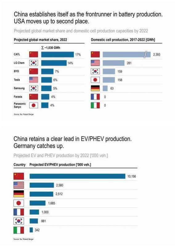 根據(jù)調(diào)查報告,中國在動力電池生產(chǎn)領(lǐng)域世界第一,中國的領(lǐng)先優(yōu)勢明顯與別國拉大。資深顧問Alexander Busse分析:“其他國家都沒有大規(guī)模擴建本國動力電池生產(chǎn)的計劃”,“中國預(yù)計2017年到2022年期間的電池生產(chǎn)量將是2016年到2021年期間的十倍”。電池方面,歐洲國家正在逐步被中國、美國、韓國和日本甩在身后。