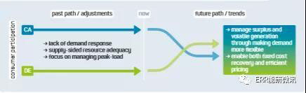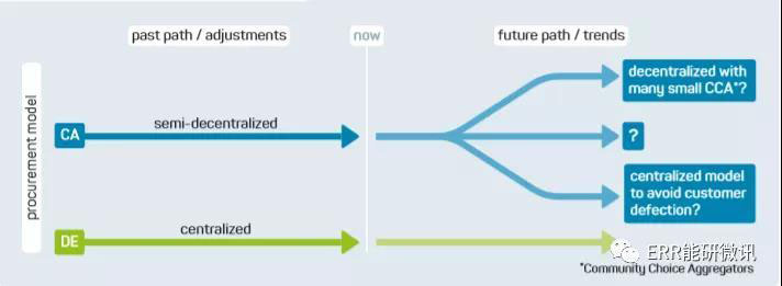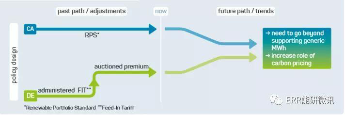 可再生能源采購。兩個(gè)地區(qū)很好的過渡了可再生能源作為外來技術(shù)的時(shí)期,現(xiàn)在面臨著將大規(guī)??稍偕茉吹碾娏ο到y(tǒng)融合。分配問題,例如我們?cè)谀睦锝◤S以及如何分配政策成本,變得更加重要。德國(guó)依靠集中采購模式。在加利福尼亞的分散管理方法中,不受監(jiān)管的社區(qū)選擇匯總器的出現(xiàn)逐漸地導(dǎo)致客戶流失。接下來,加州面臨著一個(gè)選擇:要么嘗試調(diào)整其可再生能源政策,以適應(yīng)分散的電力市場(chǎng)環(huán)境,要么通過一個(gè)更加集中的機(jī)制集中其采購決策,這種機(jī)制再次從個(gè)體零售供應(yīng)商手中奪走了自由裁量權(quán)。趨勢(shì)概述見圖ES-3,具體說明詳見第4.2節(jié)。