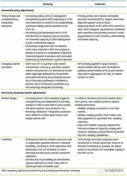 在第3節(jié),我們?cè)诖吮尘跋驴紤]如何設(shè)計(jì)和改革市場(chǎng)和政策,以適應(yīng)可再生能源在電力系統(tǒng)中所占份額的增長(zhǎng)。如上所述,我們注意到德國(guó),在成本并不特別令人擔(dān)憂的長(zhǎng)期"來試試"階段之后,隨著可再生能源發(fā)電達(dá)到較高水平,市場(chǎng)和政策設(shè)計(jì)方面進(jìn)行了實(shí)質(zhì)性改革,以提高政策的成本效益,使市場(chǎng)更高效3。與此相反,加州的市場(chǎng)政策變化更為漸進(jìn),且不一定是因?yàn)榭稍偕茉丛黾域?qū)動(dòng)。至少在最近,德國(guó)的政策演變可能被看作是通過法律和監(jiān)管改革發(fā)展起來的一種更為謹(jǐn)慎的能源轉(zhuǎn)變,而在加州,這一過程是由實(shí)驗(yàn)推動(dòng)的。這兩個(gè)地區(qū)都經(jīng)歷了能源成本的上漲,這引發(fā)了對(duì)推廣可再生能源的激進(jìn)政策的一些反對(duì),而且都開始擔(dān)心剛性管理的缺陷,這些缺陷有時(shí)會(huì)為可再生能源投資提供低效或不公平的激勵(lì)。表ES-1概述了電力部門的重要發(fā)展和最新趨勢(shì)以適應(yīng)可再生能源。