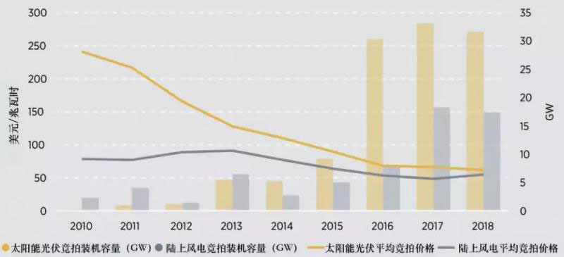 圖片:2010-2018年全球太陽能光伏與陸上風電的競拍裝機容量和平均競拍價格