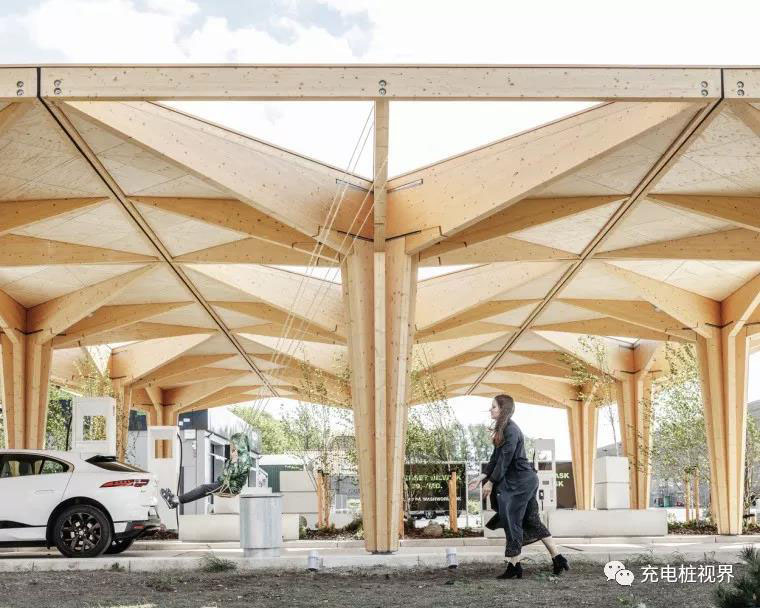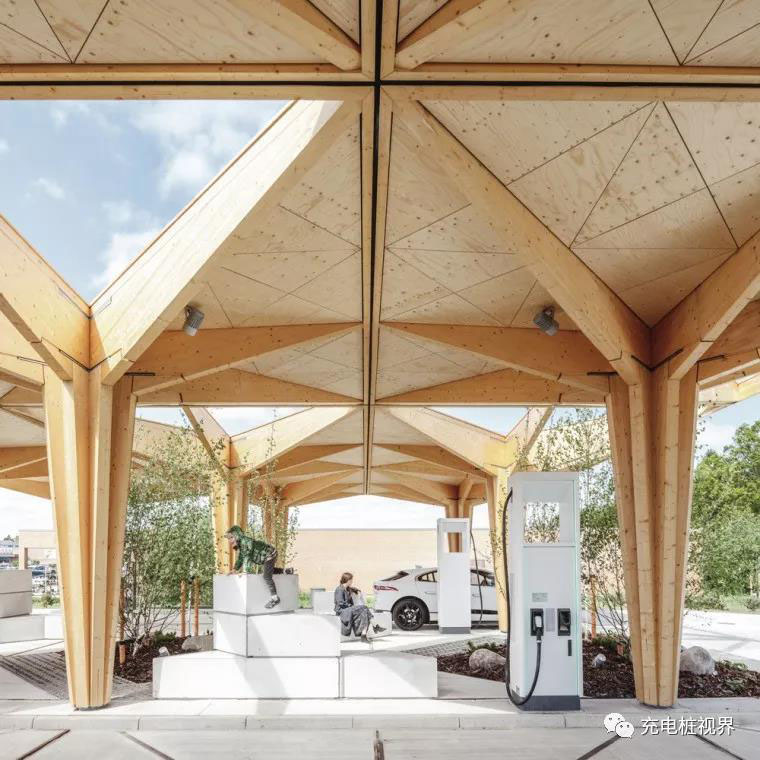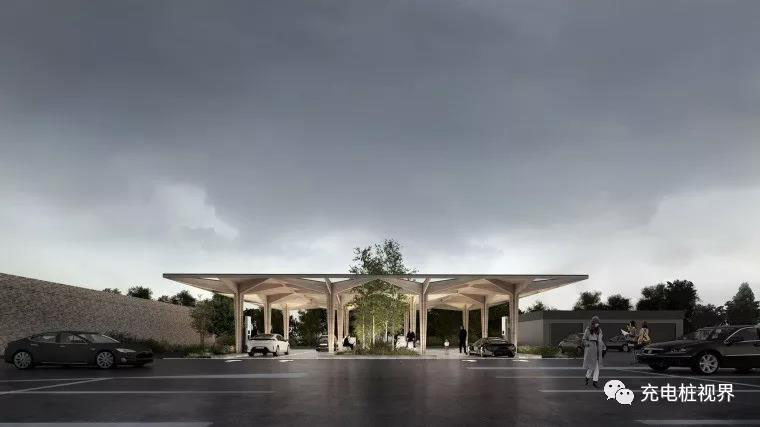 充電站由一排排“樹木”組成,樹下有一個(gè)遮陽篷,可以濾光遮陰。COBE的建筑師兼創(chuàng)始人丹·斯塔伯加德評(píng)論道:“我們?cè)O(shè)計(jì)的這個(gè)充電站,使用可持續(xù)材料,放置在一個(gè)干凈、平靜的環(huán)境中,周圍有樹木和植物,讓人們?cè)诟咚俟飞媳3謱W?。?