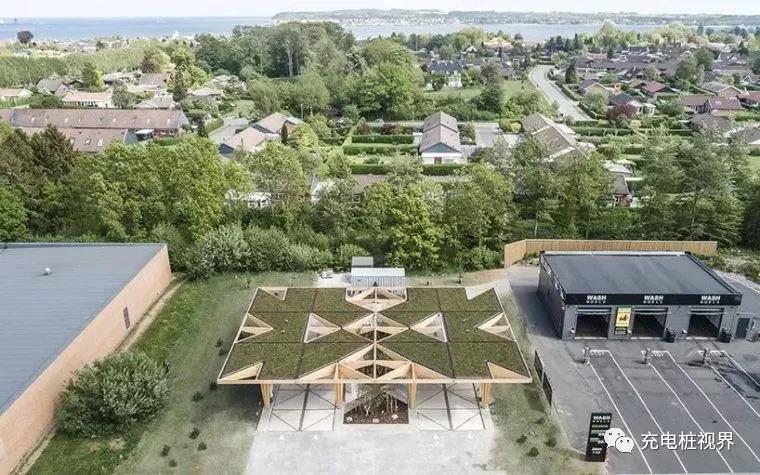 充電站由有認(rèn)證的木材和混凝土建造,頂部是太陽能電池板,周圍是與丹麥自然保護(hù)協(xié)會(huì)合作選擇的樹木、草和其他植物,目的是加強(qiáng)車站周圍的生物多樣性。