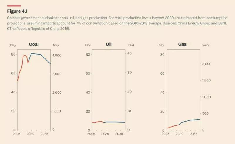 ——中國政府的計劃和預(yù)測表明,到2020年中國煤炭產(chǎn)量可能增至39億噸,此后緩慢下降。中石化預(yù)計,中國的石油產(chǎn)量將保持在每天約400萬桶。預(yù)期需求增加,中石化預(yù)計天然氣產(chǎn)量將繼續(xù)快速增長,到2040年將是目前水平的兩倍以上,但中國仍然是主要的天然氣進口國。
