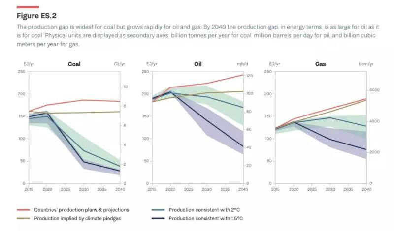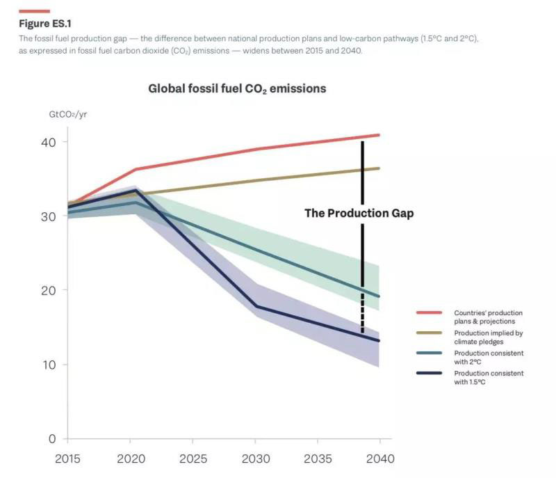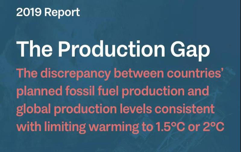 聯(lián)合國開發(fā)計劃署、瑞典環(huán)境研究所日前發(fā)布2019年P(guān)roduction Gap(化石能源超產(chǎn))報告,評估了全球各國政府化石燃料生產(chǎn)計劃與巴黎氣候協(xié)定的全球生產(chǎn)水平(與1.5°C和2°C路徑一致)之間的差異。報告結(jié)論是各國政府計劃到2030年的化石燃料的生產(chǎn)量比2°C溫升控制水平高出約50%,比1.5°C溫升控制水平高出120%。