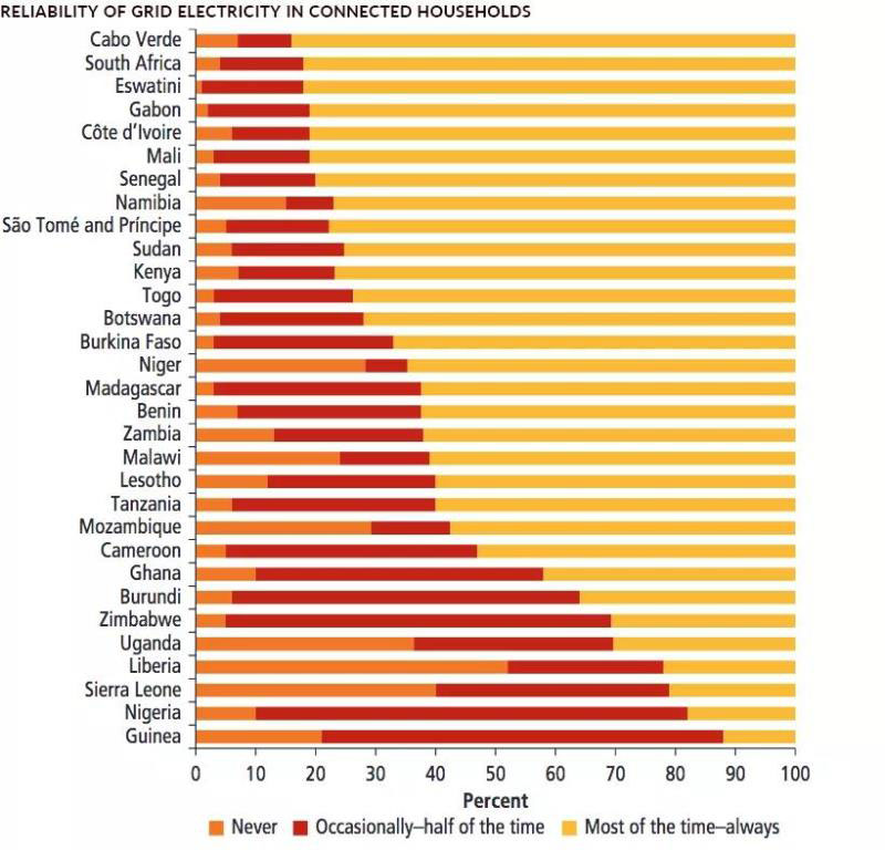 在有電網(wǎng)的地方,不穩(wěn)定還會(huì)引起其他問題。最近的一項(xiàng)調(diào)查發(fā)現(xiàn),大多數(shù)尼日利亞科技公司每月面臨30次或更多的停電,并且超過一半的人將電力視為開展業(yè)務(wù)的“主要”或“嚴(yán)重”限制。