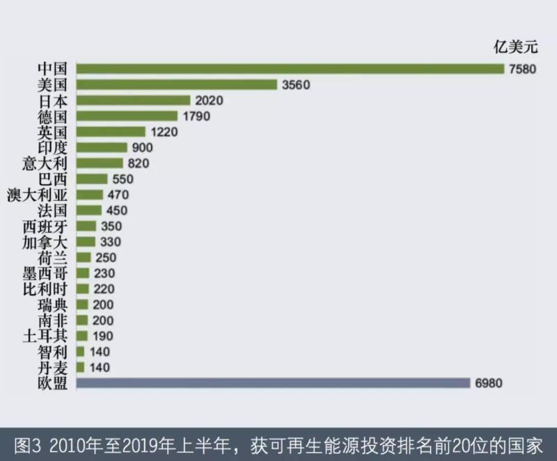 總體而言,包括其他可再生能源技術(不包括大型水電),2010―2019年期間的裝機投資將達到2.6萬億美元。到目前為止,近十年中獲得投資最多的國家是中國。數據顯示,2010年初至2019年年中,中國獲得投資額為7580億美元。在此期間,歐盟獲得6980億美元投資,美國獲得3560億美元投資。2018 年,全球做出最終投資決定的15個最大可再生能源項目中,有10個位于歐洲北海和中國的海上風電項目。另外5個是南非和美國的陸上風電項目、摩洛哥的光伏發(fā)電項目、英國的生物質能項目以及智利的太陽能發(fā)熱項目。