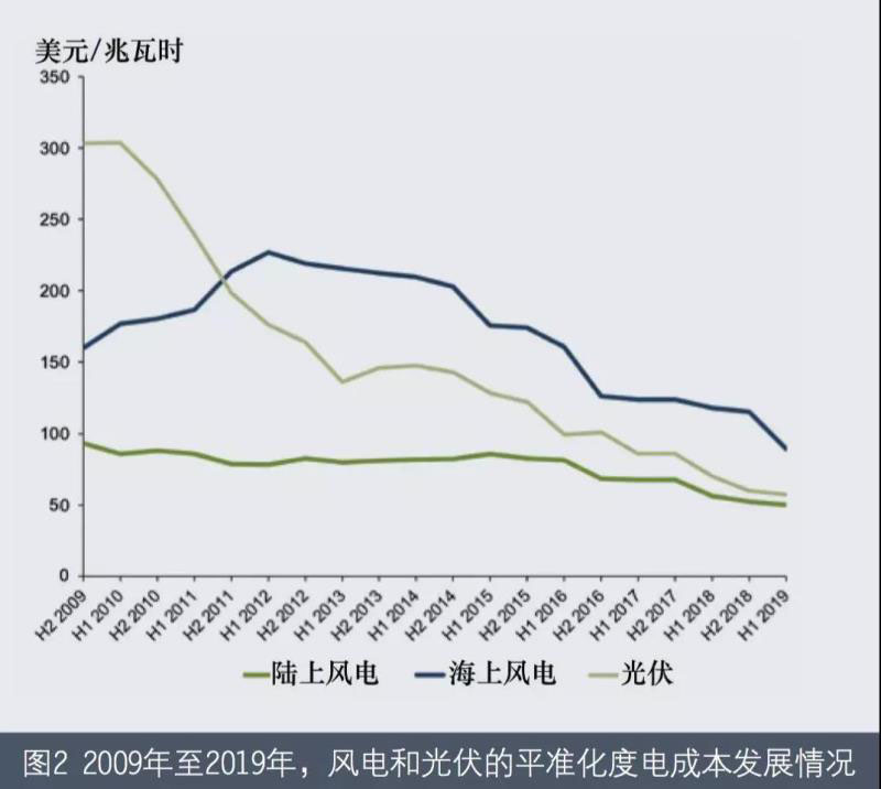 成本也發(fā)生了翻天覆地的變化。自2009 年下半年以來,太陽能采用非跟蹤系統的光伏電站發(fā)電的全球平準化度電成本下降了81%,陸上風力發(fā)電下降46%,海上風力發(fā)電下降44%。2019 年,在許多國家,光伏和風電是新增電力裝機中最便宜的兩種發(fā)電形式。
