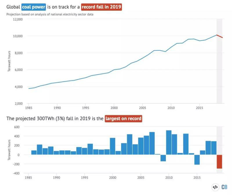 根據(jù)CarbonBrief發(fā)表報(bào)告,基于2019年前10個(gè)月來自世界各國(guó)的每月電力部門數(shù)據(jù),全球煤炭發(fā)電量有望在2019年下降3%左右(將減少約300太瓦時(shí),TWh),超過去年德國(guó)、西班牙和英國(guó)的煤電總產(chǎn)量,創(chuàng)歷史上最高跌幅。