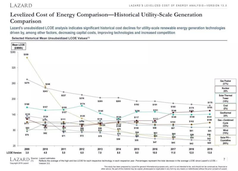 陸上風(fēng)電:下降70%(2009年135美元/兆瓦時,2019年41美元/兆瓦時)