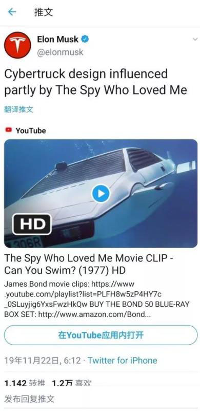 特斯拉首席執(zhí)行官埃隆·馬斯克在發(fā)布會上表示,皮卡發(fā)展了100多年,完全是一個模樣,特斯拉要造極其“與眾不同”的皮卡。而Cybertruck的外觀設(shè)計靈感正來自于1977年上映的《007之海底城》(The Spy Who Loved Me)電影中詹姆斯·邦德駕駛的超級蓮花跑車Lotus S1 Esprit,顯得格外與眾不同。