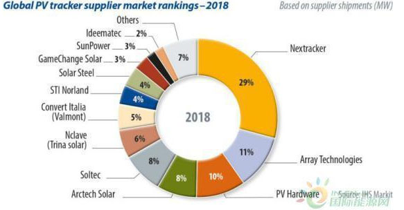前十大跟蹤器供應(yīng)商繼續(xù)受益于光伏跟蹤器技術(shù)的廣泛采用,并且所有供應(yīng)商在2018年均實(shí)現(xiàn)了同比增長的出貨量。Nextracker連續(xù)四年保持市場領(lǐng)先地位,占全球光伏跟蹤器出貨量市場份額的29%。Array Technologies仍是第二大供應(yīng)商,其次是PV Hardware,Arctech Solar和Soltec。