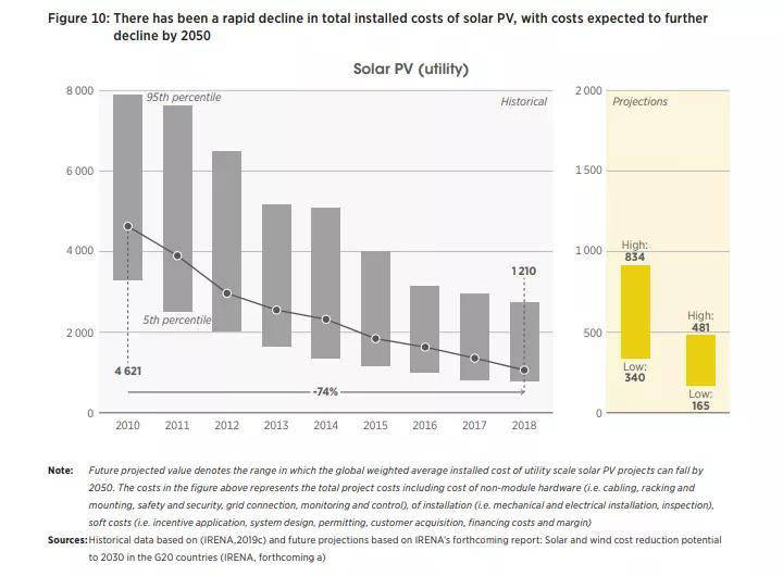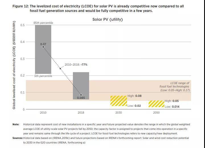 光伏技術(shù)的不斷提高是光伏成為廉價(jià)能源的重要推動(dòng)力。通過對(duì)全球光伏項(xiàng)目拍賣中標(biāo)價(jià)格整理追蹤表明,明年太陽能發(fā)電的平均價(jià)格將達(dá)到0.048美元/千瓦時(shí),相比2018年的光伏發(fā)電成本低44%。報(bào)告中稱,“最近在阿布扎比,智利,迪拜,墨西哥,秘魯和沙特阿拉伯地區(qū)太陽能光伏的拍賣價(jià)格創(chuàng)歷史新低,這表明在全球范圍內(nèi),LCOE(電力平準(zhǔn)化成本)為0.03美元/千瓦時(shí)是可能的”。