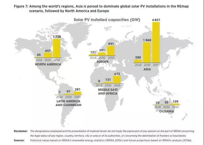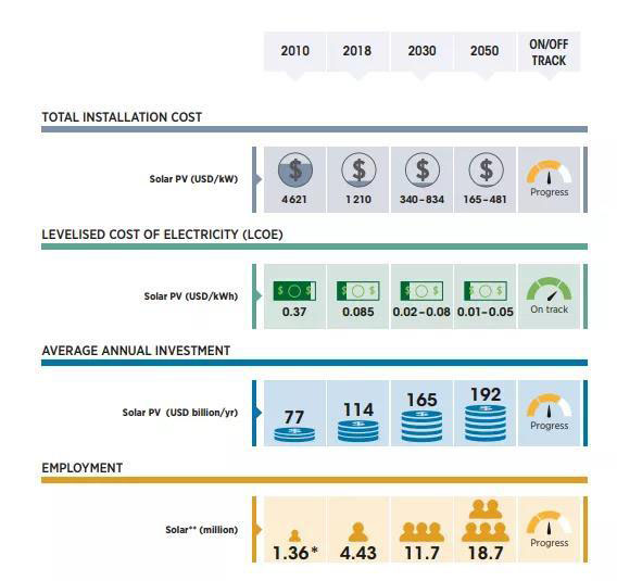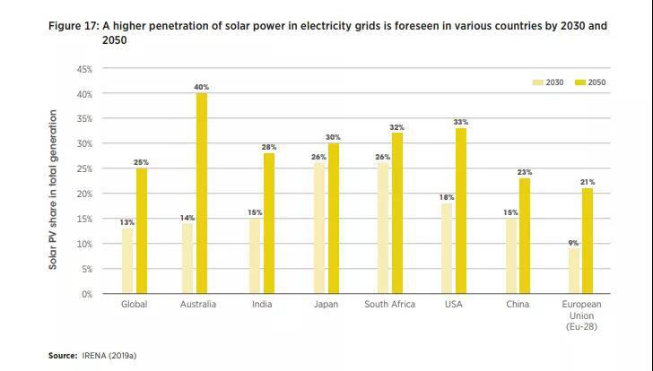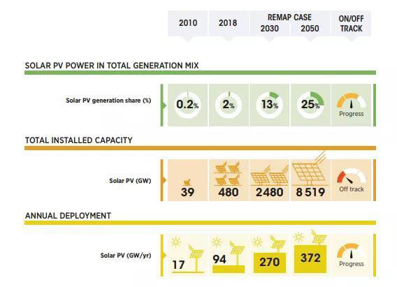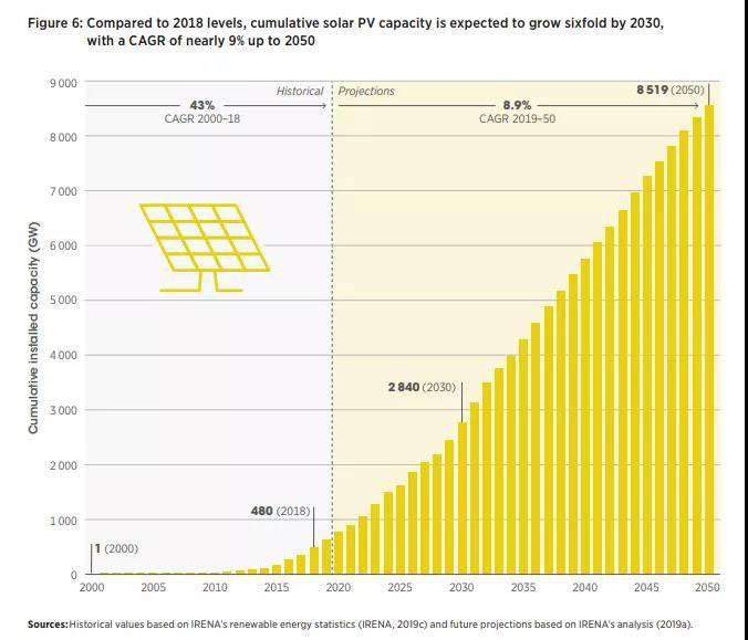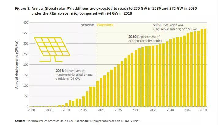 而若要達(dá)到2050年全球裝機(jī)8.519TW的目標(biāo),就需要將太陽能年新增裝機(jī)速度從2018年的94GW提高到到2050年的每年372GW。屆時(shí)太陽能裝機(jī)量將從2018年的2%增長(zhǎng)到2030年的13%再到2050年的25%。