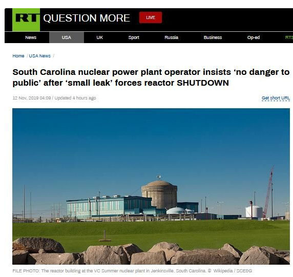 “今日俄羅斯”(rt)12日報道稱,美國南卡羅萊納州一座核電站因泄漏事故被迫無限期停止運行,但核電站的運營者卻認為,這次事故非常輕微,沒必要告知公眾。其表態(tài)也引發(fā)專家有關(guān)“缺乏透明度”的批評。