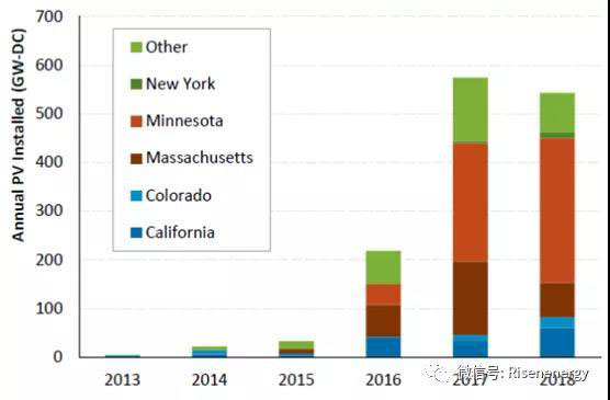 截止2018年底,就裝機量而言,屋頂光伏太陽能77%的裝機量集中在前五個州,其中明尼蘇達(dá)州占39%。就發(fā)電量而言,屋頂光伏太陽能85%發(fā)電量集中在前五個州,其中明尼蘇達(dá)州占55%。